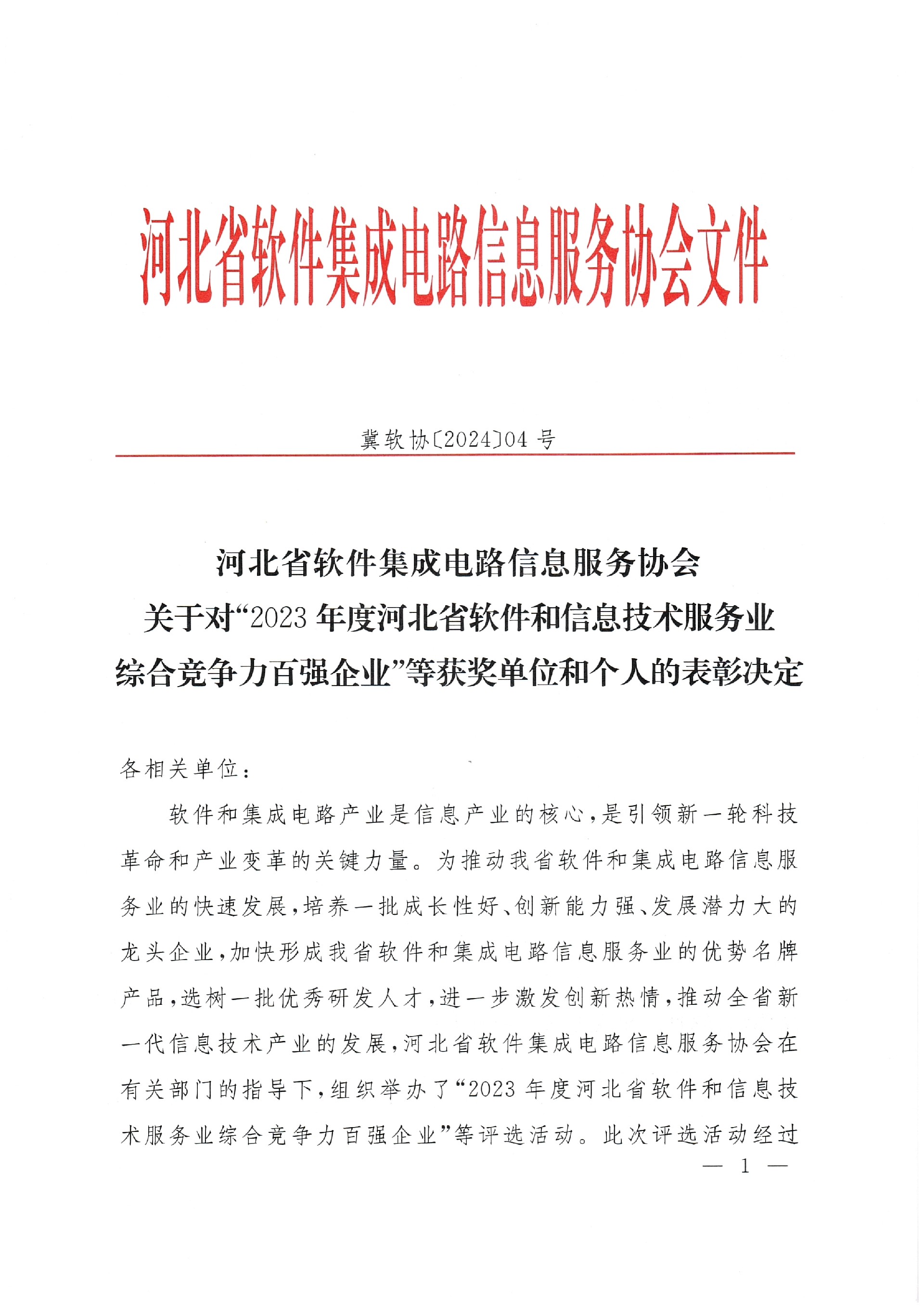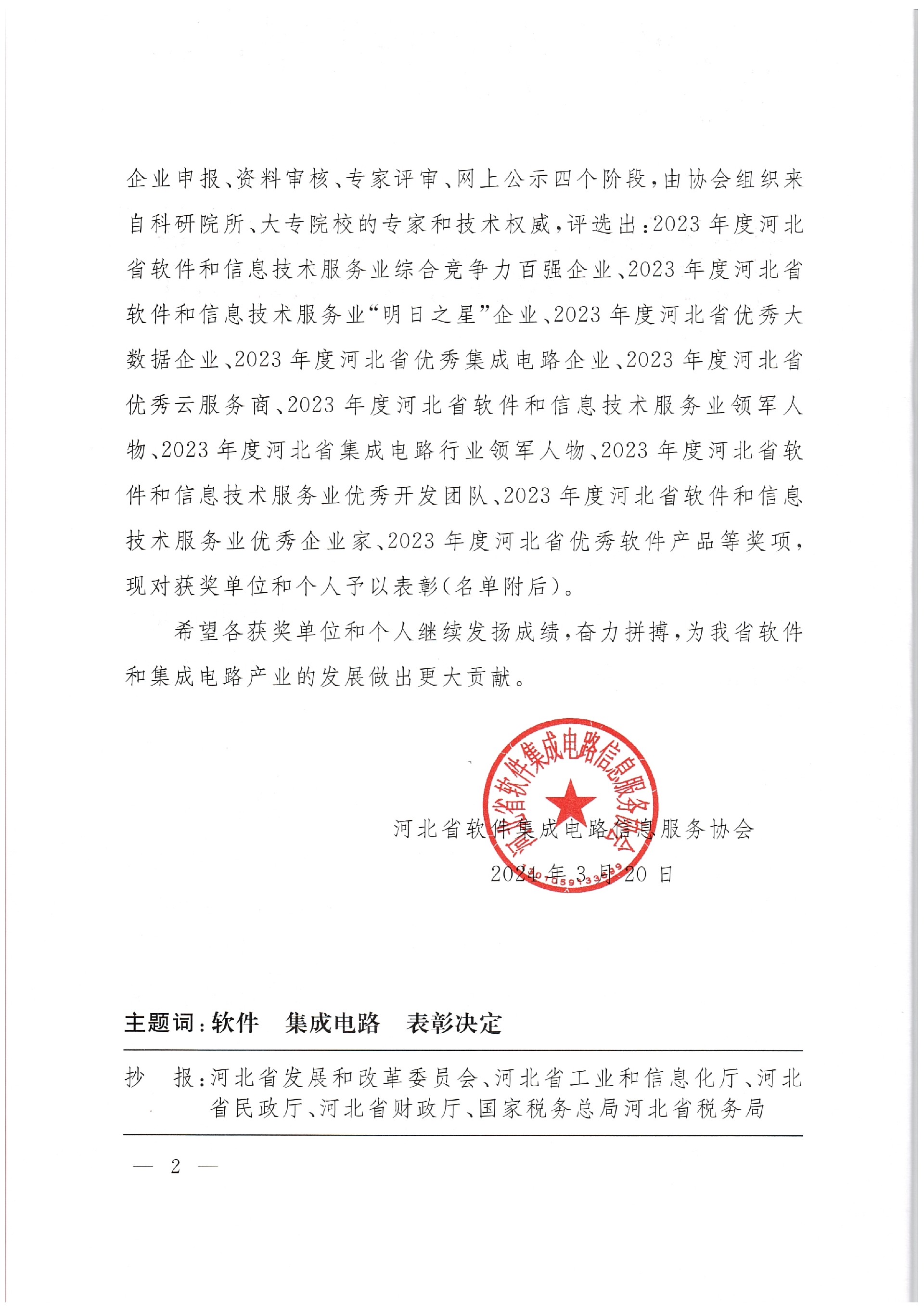 近日,公司“安勝彪開發(fā)團隊”被評為“2023年度河北省軟件和信息技術服務業(yè)優(yōu)秀開發(fā)團隊”。