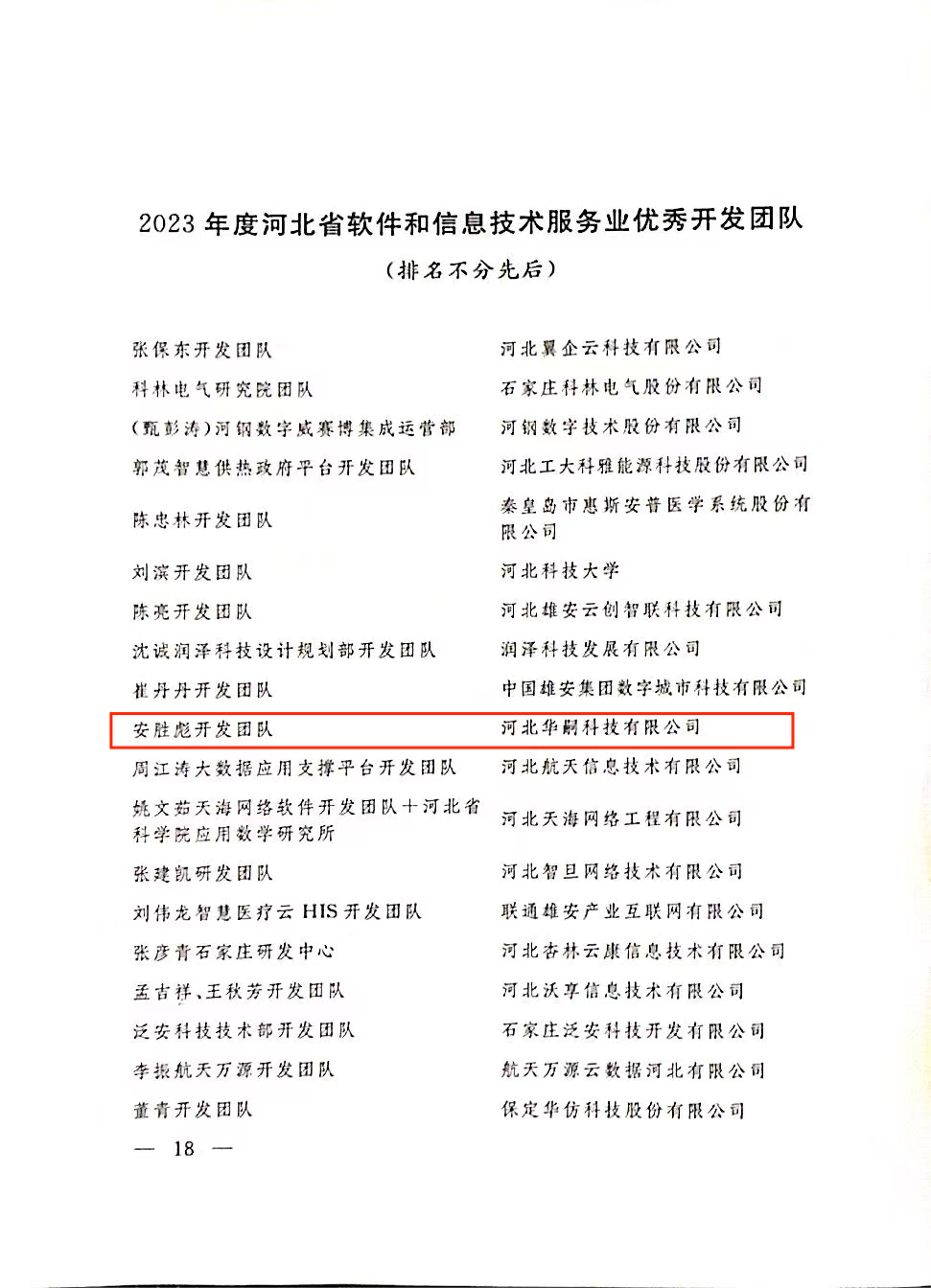 熱烈祝賀華嗣科技“安勝彪開發(fā)團隊”獲得2023年度河北省軟件和信息技術服務業(yè)優(yōu)秀開發(fā)團隊